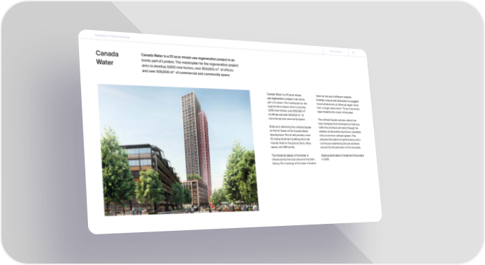 Keyprojects | Highrise buildings Go to contents 55 Canada Canada Water is a 53 acre mixed-use regeneration project in an Water iconic part of London. The masterplan for the regeneration project aims to develop 3,000 new homes, over 600,000 m² of offices and over 300,000 m² of commercial and community space. Canada Water is a 53 acre mixed- down by the use of different material use regeneration project in an iconic finishes, colours and articulation to suggest part of London. The masterplan for the three tall elements of differing height rather regeneration project aims to develop than a single tower block. These 3 elements 3,000 new homes, over 600,000 m² taper towards the crown of the tower. of offices and over 300,000 m² of commercial and community space. The unitised façade solution, which has been designed and developed by Staticus, Staticus is delivering the unitised façade fulfils the architectural intent through the on Plot A1 Tower of the Canada Water addition of decorative aluminium cassettes development. Plot A1 will provide a new onto a common unitised system. This 35-storey landmark building which will ensures that optimum performance and a include retail on the ground floor, office continuous weathering line are achieved space, and 186 homes. around the full perimeter of the floorplate. The industrial design of the tower is Staticus estimates to implement the project influenced by the local area and the site's in 2024. history. The massing of the tower is broken