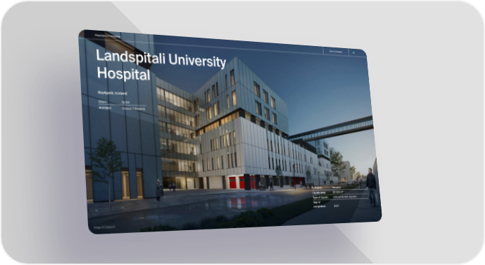 Keyprojects | Hospitals Go to contents 37 Landspitali University Hospital Reykjavik, Iceland Client: NLSH Architect: Corpus 3 (Iceland) Category: Hospital Façade area: 30 000 m² Type of façade: Unitized & stick façades Year of completion: 2027 Image © Corpus 3