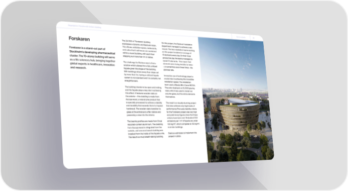 Keyprojects | Facade with timber cladding Go to contents 62 Forskaren The 24 000 m² Forskaren building On this project, the Staticus' installation expresses a dynamic architectural vision. department managed to achieve a new The offices, exhibition space, restaurants, record. The two installation teams working Forskaren is a stand-out part of and cafes that it will house are contained on this project installed an average of Stockholm's developing pharmaceutical within a round building, with each floor 18 elements every day. On their most cluster. The 10-storey building will serve stepping out more than 1m in radius. productive day, the teams managed to install 74 elements. This meant that as a life sciences hub, bringing together The challenge for Staticus was to find a elements were being installed at twice global experts in healthcare, innovation solution which allowed for a fully unitized - or sometimes even three times - the and research. façade given the shape of the building. planned rate. With buildings where every floor steps out by more than 1m, having a unitized façade Innovative use of technology played a system is not standard and it is certainly not crucial role in achieving this incredible straightforward. installation speed. The installation team used a Maeda Mini Crane MC104. The building intends to be open and inviting, They also deployed an SL1009 glazing and the façade plays a key role in achieving robot, which was used to install not this effect. It features wooden slats on only the glass, but the entire elements the exterior – this cladding is made from themselves. Accoya wood, a natural pine product that is specially processed to achieve a stability The result is a visually stunning project and durability that exceeds that of a tropical that also achieves very high levels of hardwood. The wooden slats transition to performance.The susta inability criteria glass at the entrance to offer visitors and for the Forskaren project was very high passersby a view into the interior. and preliminary figures show that these criteria have been met. Embodied CO2 The bearing profiles are made from Circal emissions per 1 m2 of façade are under recycled-content aluminium. The cladding 100 kg/m², which compares to 150 kg/m2. from Accoya wood is integrated from the in similar buildings. outside, and veneered wood cladding was installed from the inside of the façade units. Staticus estimates to implement the The result is a truly breath-taking building. project in 2023. Image © 3XN