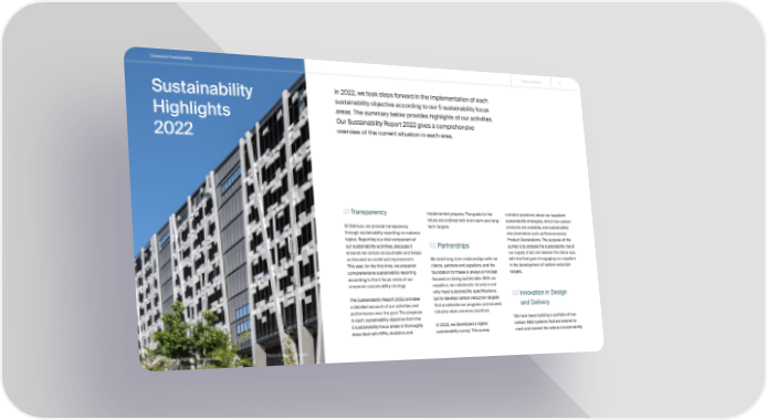 Corporate Sustainability Go to contents 17 Sustainability In 2022, we took steps forward in the implementation of each sustainability objective according to our 5 sustainability focus Highlights areas. The summary below provides highlights of our activities. Our Sustainability Report 2022 gives a comprehensive 2022 overview of the current situation in each area. 01 Transparency implemented projects. The goals for the contains questions about our suppliers’ future are outlined with short-term and long- sustainability strategies, which low-carbon At Staticus, we provide transparency term targets. products are available, and sustainability through sustainability reporting on material documentation such as Environmental topics. Reporting is a vital component of Product Declarations. The purpose of the our sustainability activities, because it 02 Partnerships survey is to analyse the sustainability risk of ensures we remain accountable and keeps our supply chain and assess the status quo, us focused on continual improvement. We build long-term relationships with our with the final goal of engaging our suppliers This year, for the first time, we prepared clients, partners and suppliers, and the in the development of carbon reduction comprehensive sustainability reporting foundation for these is always a mindset targets. according to the 5 focus areas of our focused on being sustainable. With our corporate sustainability strategy. suppliers, we collaborate closely to not only meet sustainability specifications, 03 Innovation in Design The Sustainability Report 2022 provides but to develop carbon reduction targets a detailed account of our activities and that accelerate our progress and exceed and Delivery performance over the year. The progress industry-wide common practices. in each sustainability objective from the We have been building a portfolio of low- 5 sustainability focus areas is thoroughly In 2022, we developed a digital carbon R&D systems that are tailored to described with KPIs, statistics and sustainability survey. This survey meet and exceed the relevant sustainability Økern Portal | Norway, Oslo Photo © Andrius Gudelis