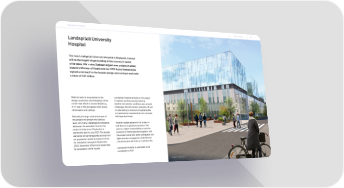 Keyprojects | Hospitals Go to contents 38 Landspitali University Hospital The new Landspitali University Hospital in Reykjavik, Iceland will be the largest single building in the country. In terms of its value, this is also Staticus' largest ever project. In 2022, Iceland's Minister of Health and our CEO Aušra Vankevičiūtė signed a contract for the façade design and contract work with a value of €47 million. Staticus' team is responsible for the Landspitali Hospital is Staticus' first project design, production and installation of the in Iceland, and the country's extreme curtain wall, which is around 30,000 sq. weather and seismic conditions also present m. in size. It includes glass roofs, doors, challenges. We will conduct extensive off and rainscreens, and ceilings. on-site testing to ensure our façade is able to meet seismic requirements and can cope Naturally, the large scale and scope of with high wind loads. this project will present the Staticus team with many challenges to overcome. Another notable aspect of this project is Moreover, the execution time for this that there is no general contractor. This project is fairly short. Production is places a higher responsibility on us to be planned to start in July 2023. The façade proactive in finding solutions together with elements will be transported by ship from the project owner and other contractors. Our our production facility to Iceland in time Agile process management and effective for installation to begin in September communication will help us to achieve this. 2023. November 2024 is the target date for completion of the façade. Landspitali Hospital is estimated to be completed in 2027. Image © Corpus 3