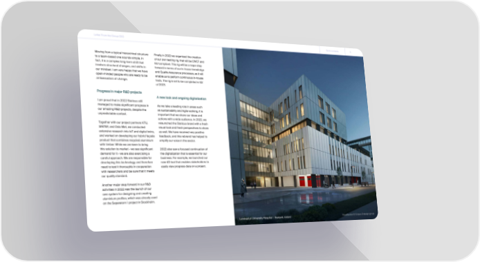 Letter From the Group CEO Go to contents 5 Moving from a typical hierarchical structure Finally, in 2022 we organised the creation to a team-based one sounds simple. In of our own testing rig, that will be CWCT and fact, it is a complex long-term shift that EU compliant. This rig will be a major step involves structural changes, and shifts in forward in terms of our in-house knowledge our mindset. I am very happy that we have and Quality Assurance processes, as it will open-minded people who are ready to be enable us to perform continuous in-house ambassadors of change. tests. The rig is set to be completed in Q2 of 2023. Progress in major R&D projects A new look and ongoing digitalization I am proud that in 2022 Staticus still managed to make significant progress in As we take a leading role in areas such our amazing R&D projects, despite the as sustainability and Agile working, it is unpredictable context. important that we share our ideas and actions with a wide audience. In 2022, we Together with our project partners KTU, relaunched the Staticus brand with a fresh SINTEF, and Oslo Met, we conducted visual look and fresh perspectives to share extensive research into IoT and digital twins, as well. We have received very positive and worked on developing our hybrid façade feedback, and this rebrand has helped to product that combines recycled aluminium amplify our voice in the sector. with timber. While we are keen to bring this solution to market - we see significant 2022 also saw a focused continuation of demand for it - we are also exercising a the digitalization that is essential for our careful approach. We are responsible for business. For example, we launched our developing this technology, and therefore new 4D tool that enables stakeholders to need to test it thoroughly in cooperation easily view progress data on a project. with researchers and be sure that it meets our quality standard. Another major step forward in our R&D activities in 2022 was the launch of our own system for designing and creating aluminium profiles, which was already used on the Separatorn 1 project in Stockholm. Landspitali University Hospital | Reykjavik, Iceland VVisualisatisualisation © Cion © Corpus 3 deorpus 3 design grsign groupoup