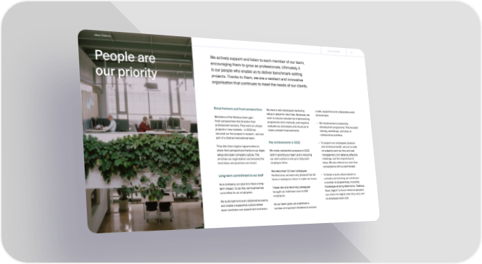 About Staticus Go to contents 12 We actively support and listen to each member of our team, People are encouraging them to grow as professionals. Ultimately, it is our people who enable us to deliver benchmark-setting our priority projects. Thanks to them, we are a resilient and innovative organisation that continues to meet the needs of our clients. Broad horizons and fresh perspectives We have a well-developed mentoring a safe, supportive and collaborative work setup in place for new hires. Moreover, we environment: Members of the Staticus team gain work to ensure inclusion by implementing fresh perspectives that broaden their progressive work methods, and regularly — We implemented a leadership professional horizons. They work on unique evaluate our processes and structure to development programme. This included projects in new markets - in 2022 we make constant improvements. training, workshops, and other of secured our first project in Iceland - and are collaborative activities; part of a diverse international team. Key achievements in 2022 — To support our employees’ physical They also have regular opportunities to and emotional health, we put on talks share their perspectives thanks to our Agile We made substantial progress in 2022 on subjects such as time and task setup and open company culture. This both in growing our team and in ensuring management, civil defence, effective enriches our organisation and ensures the our work culture is set up to help each meetings, and the importance of best ideas and practices are heard. employee thrive. sleep. We also offered our team free consultations with a psychologist. We welcomed 133 new colleagues. Long-term commitment to our staff Furthermore, we were very pleased that 32 — To foster a work culture based on former employees chose to rejoin our team. curiosity and learning, we continued As a company, our goal is to have a long- a number of programmes, including: term impact. To do this, we must be fully These new and returning colleagues knowledge-sharing afternoons, “Staticus committed to our employees. brought our total team size to 626 Goes Digital” (a forum where employees employees. can share the digital tools they use), and We build tight-knit and collaborative teams, an employee book club. and create a supportive culture where As our team grew, we undertook a team members can experiment and learn. number of important initiatives to ensure