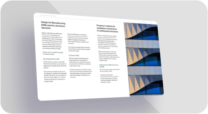 R&D Activities and Digitalization Go to contents 29 Design for Manufacturing Progress in patents for (DfM) used for aluminium installation mechanisms elements of cantilevered structures Design for Manufacturing (DfM) refers Using our DfM system, we will take full There is an increasing demand on exterior to the process of designing parts, control over the production of profiles in structures and features outboard of the components or products with ease of collaboration with an extrusion company. façade. To avoid scaffolding and disruption manufacturing in mind. The end goal System is supplied with full EN and of the safe and fast unitized curtain is to make a better product at a lower CWCT test certifications for performance wall installation, Staticus developed an cost and higher efficiency, thus more compliance. installation mechanism for cantilevered environmentally friendly, and this is structures, allowing for direct load transfer achieved by simplifying, optimising In this way, we are applying DfM, optimising to the building structure. and refining the product’s design. the production process through an iterative process with design. Staticus has developed a LT patented Staticus aims to use DfM increasingly solution related to the equipment and in its façade projects. Focuses for 2023 methods used to attach such structures. It permits the exterior cantilevered structure Key achievements in 2022 We have already started designing the to be fine adjusted once it is securely façade elements for the Separatorn 1 installed in place. In 2022, Staticus reached a major R&D project. Mock-ups, testing and production milestone by launching our own system for are planned for Q1 of 2023, and installation Achievements of 2022 and focuses designing and creating unitized aluminium is set to start in June. for 2023 systems. Through this project we are able to assess We have already received a national patent This system was already put into use on how our cross functional collaborative team for this innovation in 2022. the Separatorn 1 building in Flemingsberg, work takes shape, and continue to further Southern Stockholm. For this project, we optimize the Design for Manufacturing In 2023 we are focusing on build and install a 7,000 sq. m. unitized processes. the implementation of the customised aluminium façade that is unique for its exterior design solutions, by having curved corners. an efficient installation method and mechanism in place.