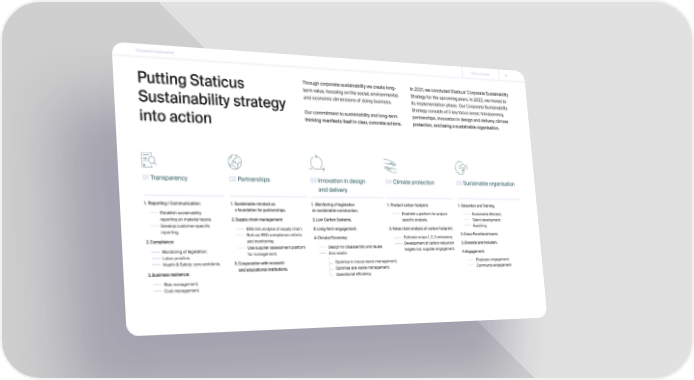 Corporate Sustainability Go to contents 16 Through corporate sustainability we create long- In 2021, we concluded Staticus’ Corporate Sustainability Putting Staticus term value, focusing on the social, environmental, Strategy for the upcoming years. In 2022, we moved to and economic dimensions of doing business. its implementation phase. Our Corporate Sustainability Sustainability strategy Strategy consists of 5 key focus areas: transparency, Our commitment to sustainability and long-term partnerships, innovation in design and delivery, climate into action thinking manifests itself in clear, concrete actions. protection, and being a sustainable organisation. 01 Transparency 02 Partnerships 03 Innovation in design 04 Climate protection 05 Sustainable organisation and delivery 1. Reporting / Communication: 1. Sustainable mindset as 1. Monitoring of legislation 1. Product carbon footprint 1. Education and Training. Establish sustainability a foundation for partnerships. on sustainable construction. Establish a platform for project- Sustainable Mindset; reporting on material topics; 2. Supply chain management: 2. Low Carbon Systems. specific analysis. Talent development; Develop customer-specific ESG risk analysis of supply chain; 3. Long-term engagement. 2. Value chain analysis of carbon footprint: Reskilling. reporting. Roll-out ESG compliance criteria 2. Cross Functional teams. 2. Compliance: and monitoring; 4. Circular Economy: Estimate scope 1, 2, 3 emissions; Use supplier assessment platform Design for disassembly and reuse; Development of carbon reduction 3. Diversity and Inclusion. Monitoring of legislation; for management. Zero waste: targets incl. supplier engagement. 4. Engagement. Labor practice; Health & Safety: zero accidents. 3. Cooperation with research Optimise in-house waste management; Employee engagement; 3. Business resilience: and educational institutions. Optimise site waste management; Community engagement Operational efficiency. Risk management; Cost management.