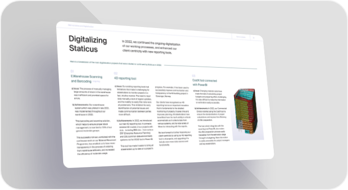 R&D Activities and Digitalization Go to contents 32 Digitalizing In 2022, we continued the ongoing digitalization of our working processes, and enhanced our Staticus client centricity with new reporting tools. Here is a breakdown of the main digitalization projects that were initiated or continued by Staticus in 2022: 01 02 03 E.Warehouse Scanning 4D reporting tool CostX tool connected and Barcoding ongoing with PowerBI a) Issue: Our existing reporting tools had progress. For example, it has been used to a) Issue: The process of manually managing limitations that made it challenging for successfully improve communication and a) Issue: Changing material costs have large amounts of stock in the warehouse stakeholders to monitor projects in a transparency in the K8 building project in made the task of calculating project was inefficient and provided space for fast, intuitive manner. The need to input Stavanger, Norway. budgets and preparing offers challenging. errors. data manually, a lack of regular updates, It is also difficult to make the information and the inability to easily filter data were Our clients have recognised our 4D on estimation easily accessible. b) Achievements: Our e.warehouse all problematic. This inhibited the early reporting tool as an important innovation system,which was piloted in late 2021, identification of potential issues and that is fundamental to the detailed b) Achievements: In 2022, our Commercial was implemented throughout our made communication between parties monitoring of projects. It saves time and Division started using the CostX tool to warehouse in 2022. more difficult. improves planning. All stakeholders have ensure the standardisation of project benefitted from the tool’s ability to refresh calculations and improve the efficiency This barcoding and scanning solution, b) Achievements: In 2022, we introduced automatically as it collects data from of offer preparation. which helps to ensure proper stock our new 4D reporting tool. It connects various systems, and its wide variety of management, is now live for 75% of our detailed 3D models of our projects with filters for interacting with the reports. This tool, which integrates with the general materials groups. data - including BIM data - from various reporting tool PowerBI, also makes ERP (Enterprise Resource Planning) We look forward to further improving our the offer preparation process easily This successful roll out, combined with the and CDE (common data environment) client-centricity by using our 4D reporting traceable, from the estimation stage continuous work on our Material Movement systems via the VCAD tool in Power BI. tool in all projects, and upgrading it to through to budgeting. Now information Programme, has enabled us to have more include even more data sources and is easily accessible for project managers transparency in the process of ordering This tool has made it easier to bring all functionality. and key stakeholders. from warehouse leftovers, and increased stakeholders up to date on a project’s the efficiency of materials usage.