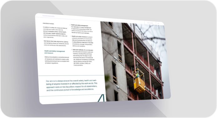 Corporate Sustainability Go to contents 23 everybody involved. — Health and safety management. Our dedicated in-house management In addition to safety, the measures Staticus is supported by specialised health and currently has in place also take into safety consultants that help us to ensure account workplace stress, mental health, that all our work is up to standard. and long-term health hazards posed by environmental factors like dust, noise, and — Health and safety measures to prevent poor ergonomics. accidents and injuries on construction sites and the factory floor, we have put Risk factors like noise, ergonomics, lighting in place effective measures in the areas and workplace stress are measured, and we of production, storage, transportation, carry out continuous risk assessments. delivery and installation. — Safe work methods. All our employees Health and Safety management are instructed and trained in safe work and measure methods, including lifting technique and working near the edge on open Staticus has adopted a comprehensive set structures that pose an increased fall of measures and methods to create a safe risk. Additional competence certificates working environment that is compliant with held by Staticus include ISO 14001, all relevant regulations. ISO 45001, Achilles, CHAS, and Constructionline. Our aim is to always ensure the overall safety, health and well- being of anyone involved in or affected by the work we do. This approach rests on two key pillars: respect for all stakeholders, and the continuous pursuit of knowledge and excellence.
