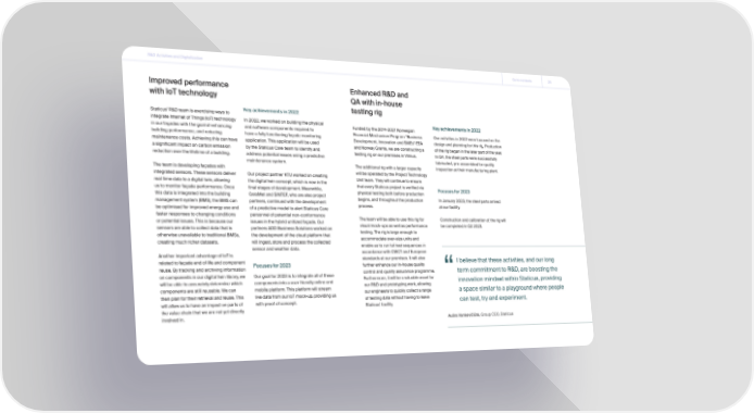 R&D Activities and Digitalization Go to contents 28 Improved performance Enhanced R&D and with IoT technology QA with in-house Staticus’ R&D team is exercising ways to Key achievements in 2022 testing rig integrate Internet of Things (IoT) technology In 2022, we worked on building the physical Funded by the 2014-2021 Norwegian Key achievements in 2022 in our façades with the goal of enhancing and software components required to Financial Mechanism Program “Business Our activities in 2022 were focused on the building performance, and reducing have a fully functioning façade monitoring Development, Innovation and SMEs” EEA design and planning for this rig. Production maintenance costs. Achieving this can have application. This application will be used and Norway Grants, we are constructing a of the rig began in the later part of the year. a significant impact on carbon emission by the Staticus Care team to identify and testing rig on our premises in Vilnius. In Q4, the steel parts were successfully reduction over the lifetime of a building. address potential issues using a predictive fabricated, pre-assembled for quality maintenance system. The additional rig with a larger capacity inspection at their manufacturing plant. The team is developing façades with will be operated by the Project Technology integrated sensors. These sensors deliver Our project partner KTU worked on creating Unit team. They will continue to ensure real time data to a digital twin, allowing the digital twin concept, which is now in the that every Staticus project is verified via us to monitor façade performance. Once final stages of development. Meanwhile, physical testing both before production Focuses for 2023 this data is integrated into the building OsloMet and SINTEF, who are also project begins, and throughout the production In January 2023, the steel parts arrived management system (BMS), the BMS can partners, continued with the development process. at our facility. be optimised for improved energy use and of a predictive model to alert Staticus Care faster responses to changing conditions personnel of potential non-conformance The team will be able to use this rig for Construction and calibration of the rig will or potential issues. This is because our issues in the hybrid unitized façade. Our visual mock-ups as well as performance be completed in Q2 2023. sensors are able to collect data that is partners ADD Business Solutions worked on testing. The rig is large enough to otherwise unavailable to traditional BMSs, the development of the cloud platform that accommodate over-size units and creating much richer datasets. will ingest, store and process the collected enable us to run full test sequences in sensor and weather data. accordance with CWCT and European Another important advantage of IoT is standards at our premises. It will also related to façade end of life and component Focuses for 2023 further enhance our in-house quality I believe that these activities, and our long reuse. By tracking and archiving information control and quality assurance programme. term commitment to R&D, are boosting the on components in our digital twin library, we Our goal for 2023 is to integrate all of these Furthermore, it will be a valuable asset for “ will be able to accurately determine which components into a user friendly online and our R&D and prototyping work, allowing innovation mindset within Staticus, providing components are still reusable. We can mobile platform. This platform will stream our engineers to quickly collect a range a space similar to a playground where people then plan for their retrieval and reuse. This live data from our IoT mock-up, providing us of testing data without having to leave will allow us to have an impact on parts of with proof of concept. Staticus’ facility. can test, try and experiment. the value chain that we are not yet directly involved in. Aušra Vankevičiūtė, Group CEO, Staticus