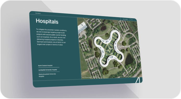 Key projects Go to contents 34 Hospitals To mitigate the uncertain market conditions, we are increasingly targeting large-scale projects with secure public-sector funding such as hospitals. As a result, we are now delivering hospital projects in Norway, Denmark and Iceland, one of which is our largest ever project in terms of value. North Zealand Hospital Landspitali University Hospital Radiumhospitalet University Hospital North Zealand Hospital | Hillerød, Denmark Image © Herzog & de Meuron – Vilhelm Lauritzen Arkitekter